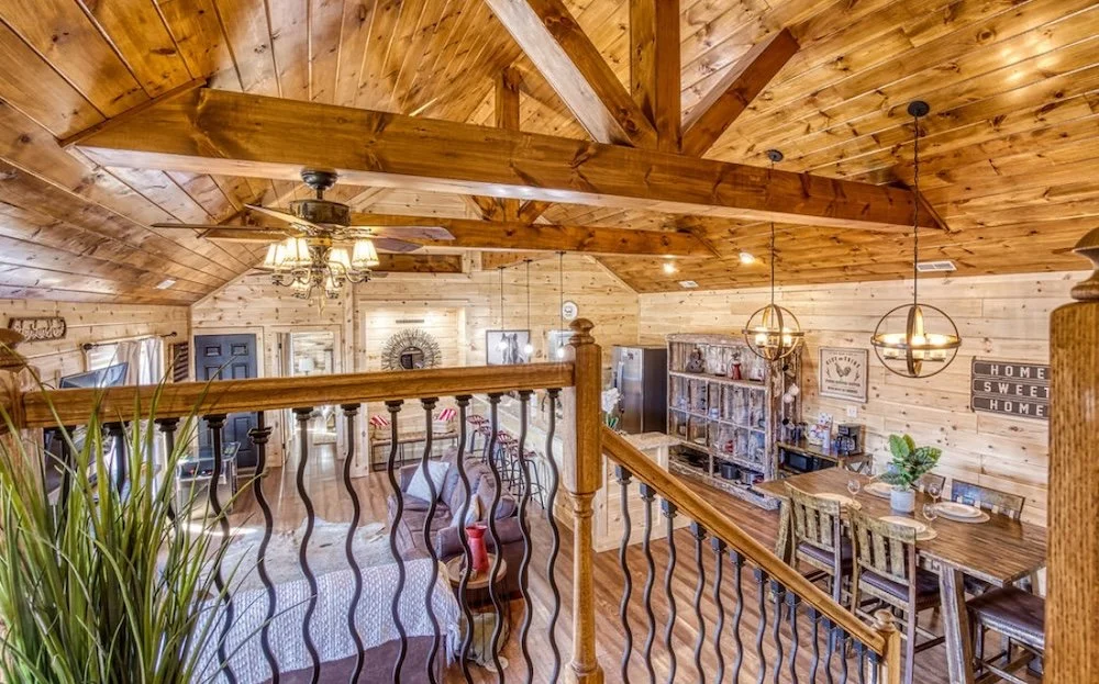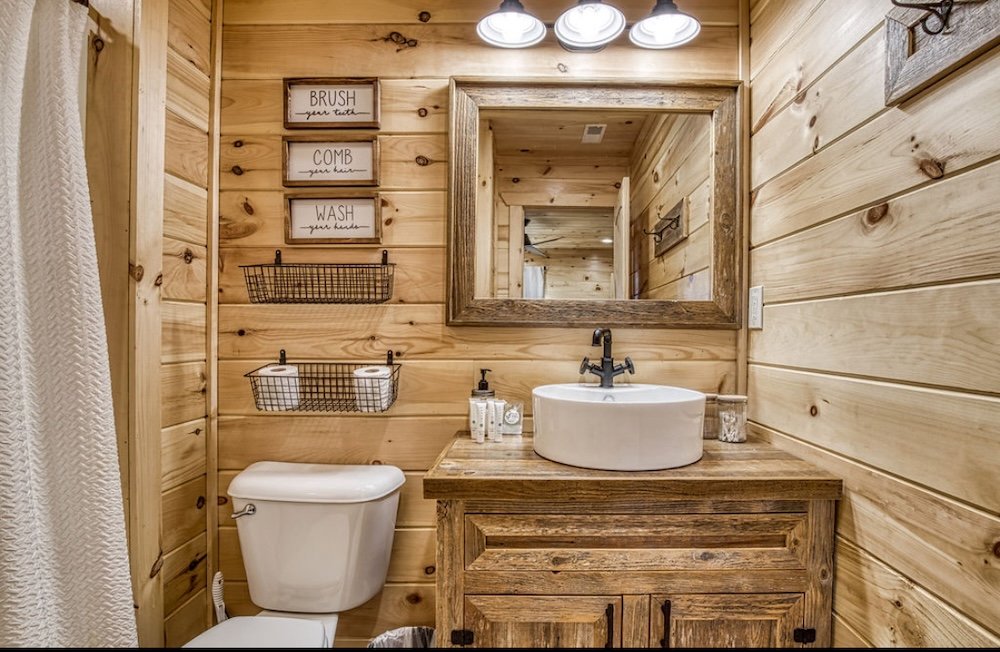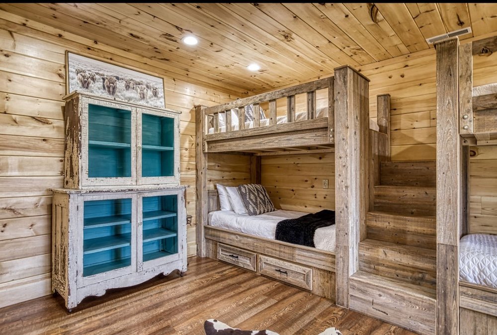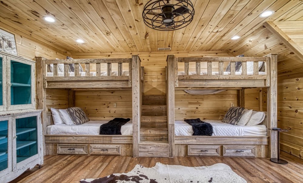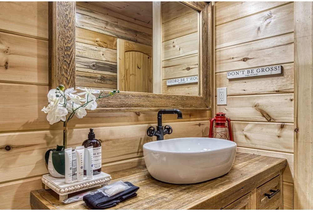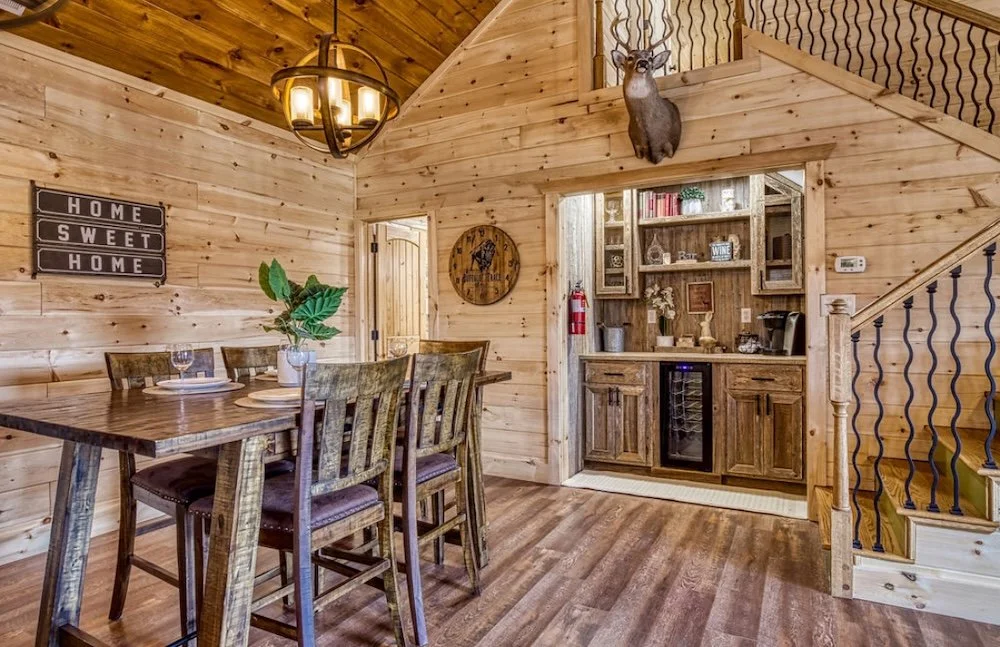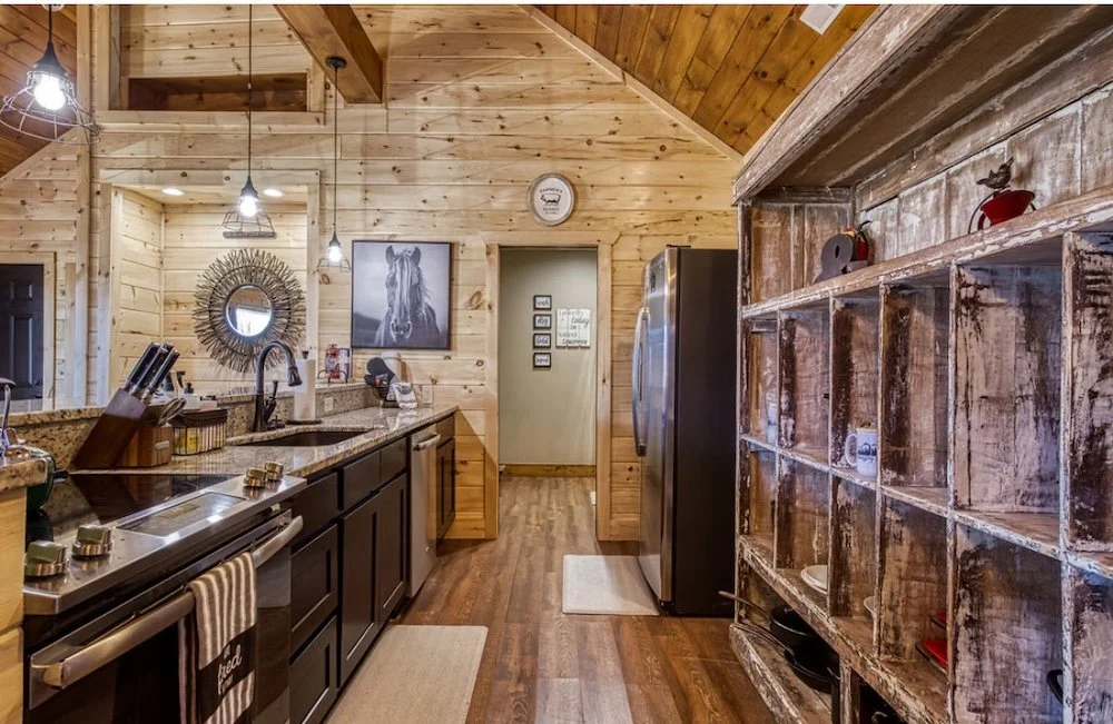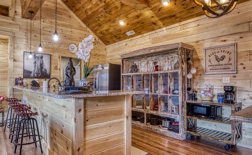 In this open concept cabin, the gourmet kitchen allows conversation to flow. Chat with the family while you enjoy cooking in this fully equipped, sparkling-new kitchen. Granite countertops, gleaming stainless steel appliances and farmhouse-style open shelving make this kitchen a stunner. Tall barstools at the kitchen bar counter harken back to old-fashioned soda shop days.
