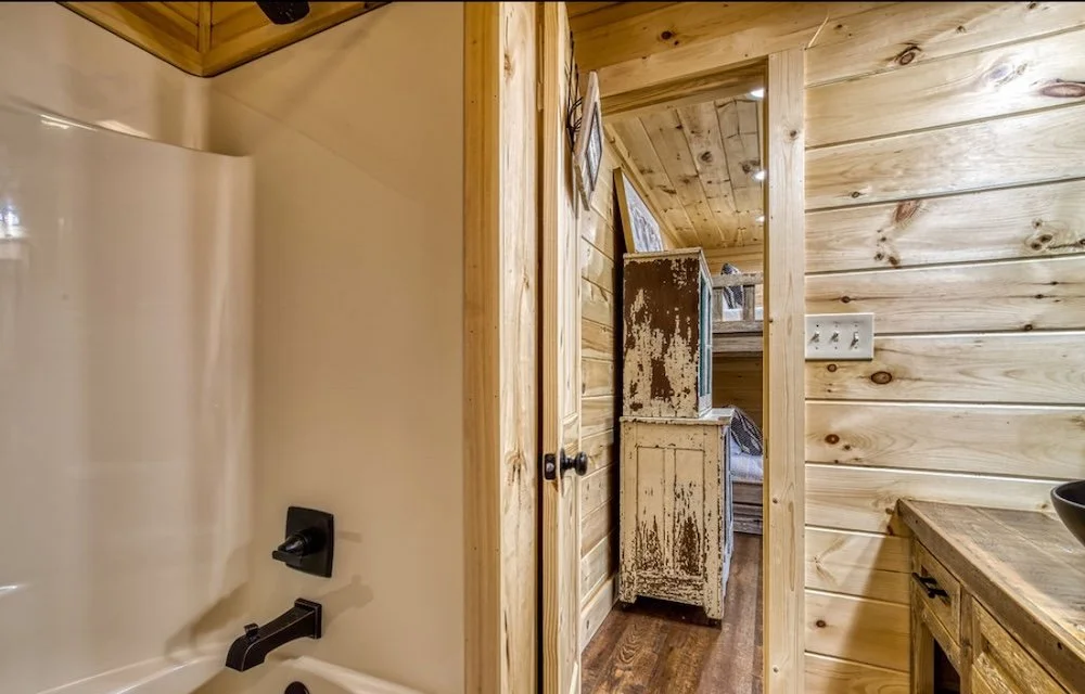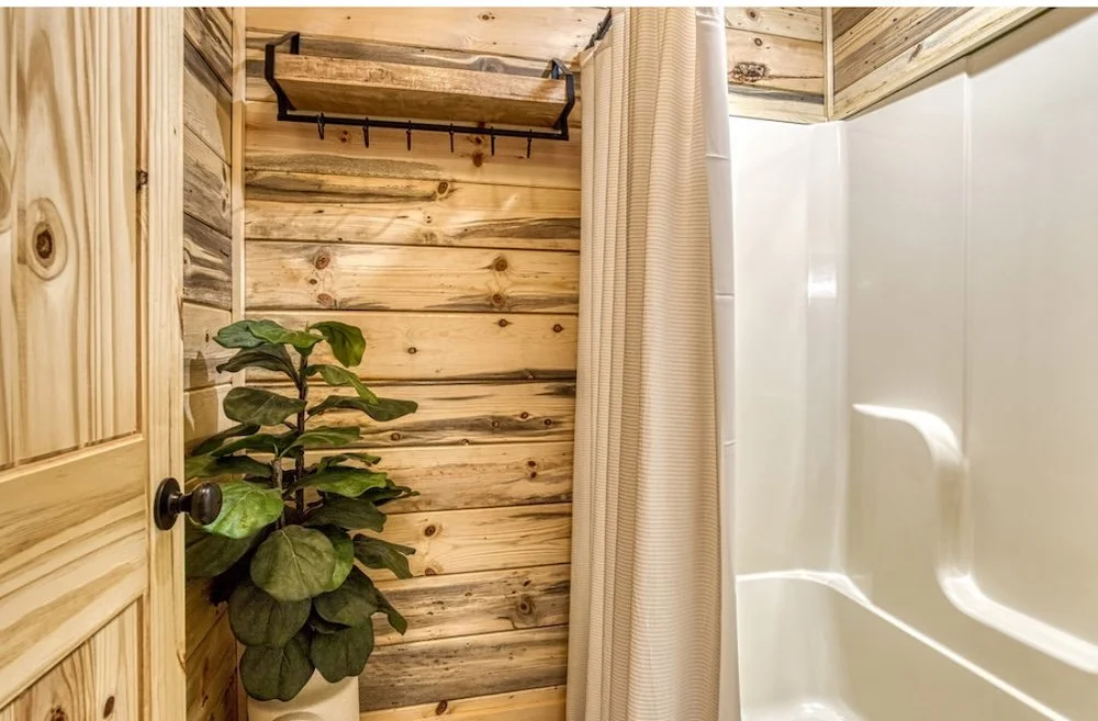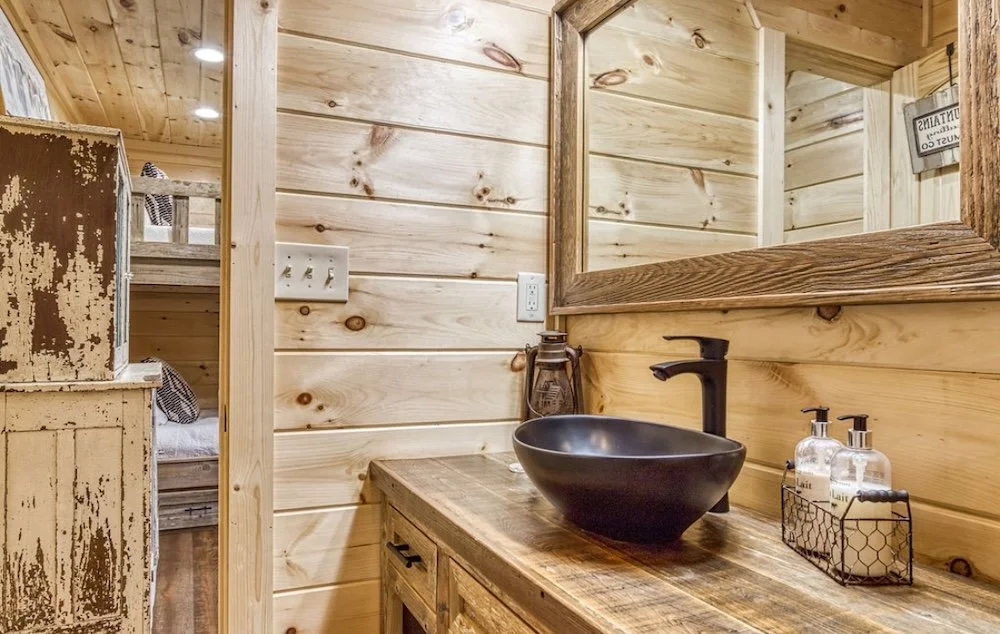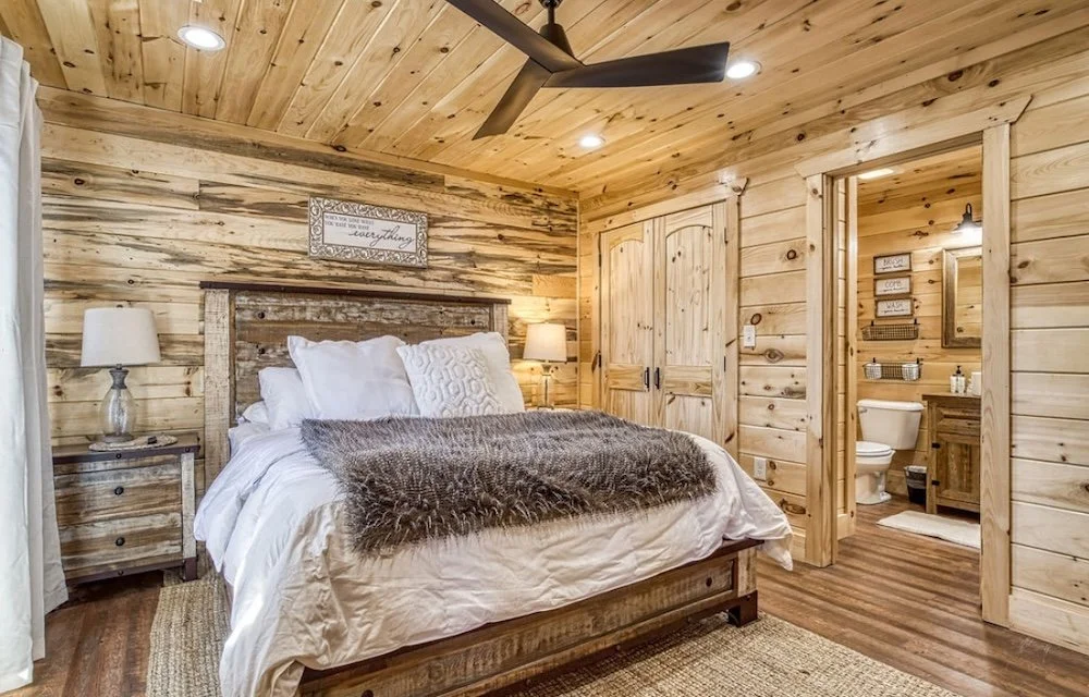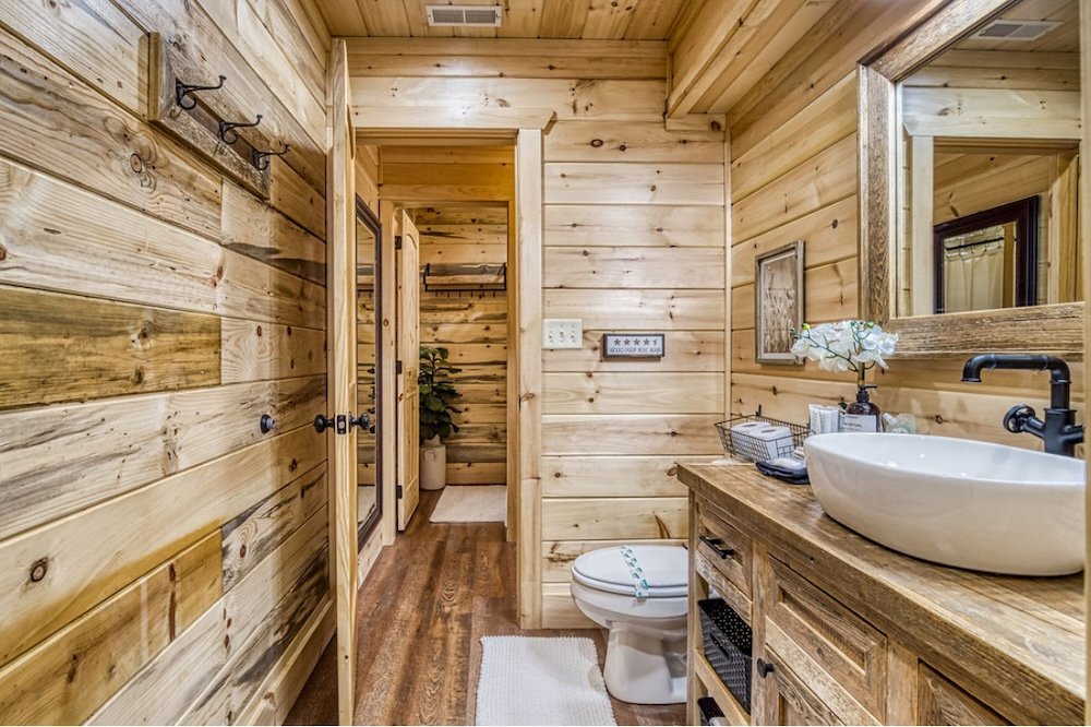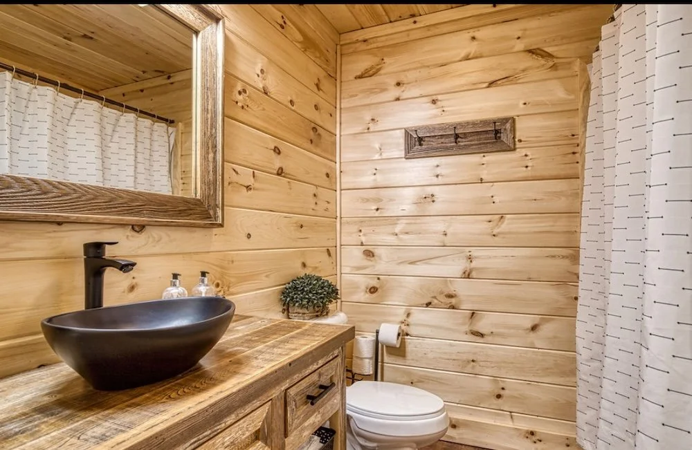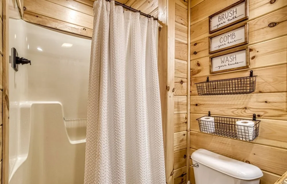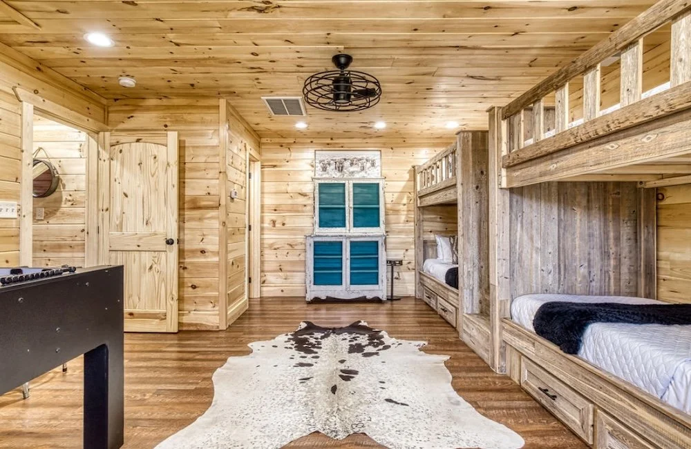 In this open concept cabin, the gourmet kitchen allows conversation to flow. Chat with the family while you enjoy cooking in this fully equipped, sparkling-new kitchen. Granite countertops, gleaming stainless steel appliances and farmhouse-style open shelving make this kitchen a stunner. Tall barstools at the kitchen bar counter harken back to old-fashioned soda shop days.